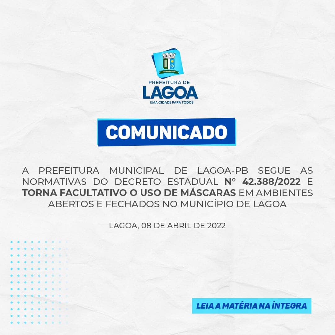 FACULTATIVO O USO DE MÁSCARAS EM AMBIENTES ABERTOS E FECHADOS NO MUNICÍPIO DE LAGOA-PB